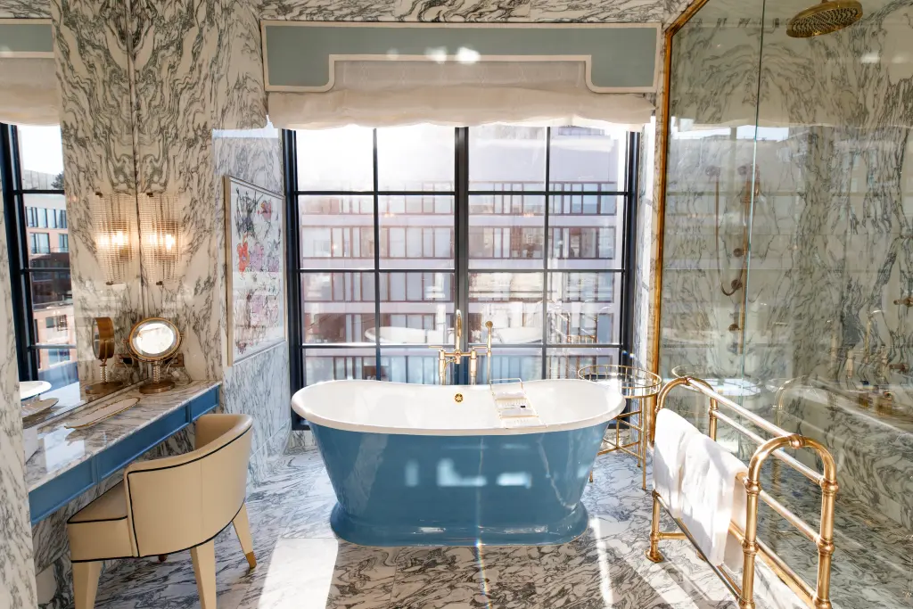 Aside from the beautiful primary bedroom with a private terrace overlooking downtown Manhattan, the opulent en-suite bathroom with a marble his-and-hers sink and free-standing tub offers guests plenty of natural light that’s perfect for photo-ops and glam sessions.