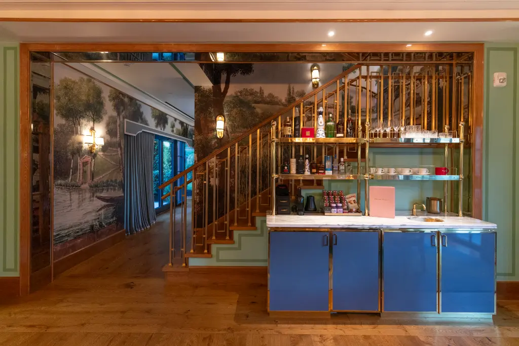 The three-bedroom, four-bathroom, three-terrace megasuite features hand-painted wallpaper inspired by a French garden, a full office, a cozy outdoor fire pit and a wet bar stocked with candy, top-shelf alcohol and sleep supplements by Kourtney Kardashian’s Lemme wellness brand.